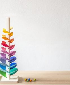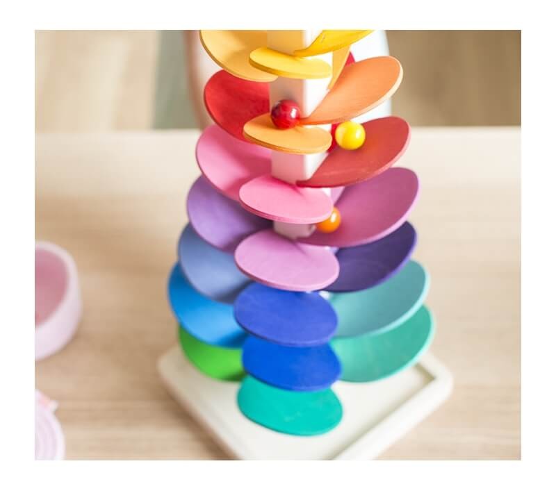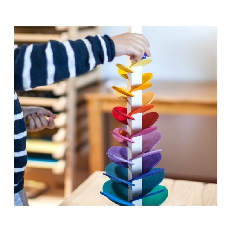La bola irá cayendo y resonando al golpear cada lengüeta de color, los niños toman conciencia de un elemento fundamental en su desarrollo: el ritmo.