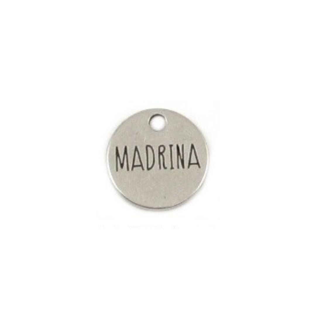 Colgante medalla con grabado madrina de 20mm de Zamak bañado en plata.