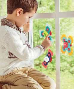 Juego de 3 spinners para bebés. Se adhieren a cualquier superficie lisa con su ventosa.  Fabricados en plástico suave y flexible y fáciles de iniciar y detener. Perfectos para desarrollar habilidades motoras fina y gruesa, causa-efecto, coordinación óculo manual, la agudeza visual…