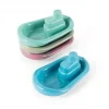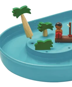 El set incluye una bandeja de caucho, un barco de remos, un barco de vela, dos figuras, un tronco, tres peces, dos árboles de diferentes alturas y un arbusto.