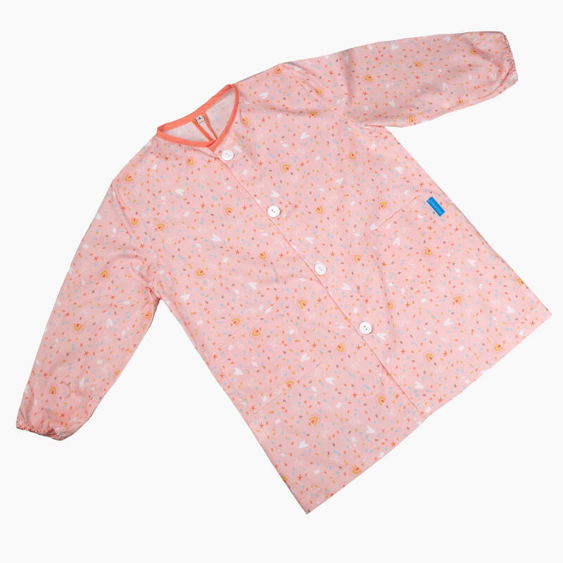 Una bonita y original bata escolar con estampado de dibujos de confeti.