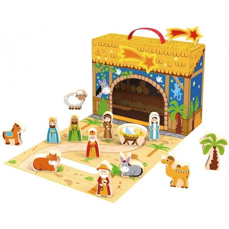 En un práctico maletín encontrarás un belén de madera natural con 15 piezas.