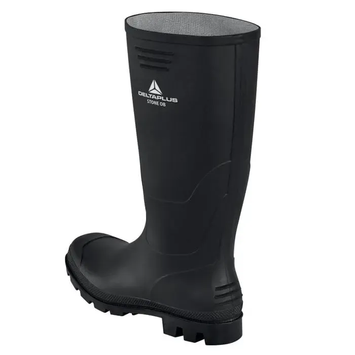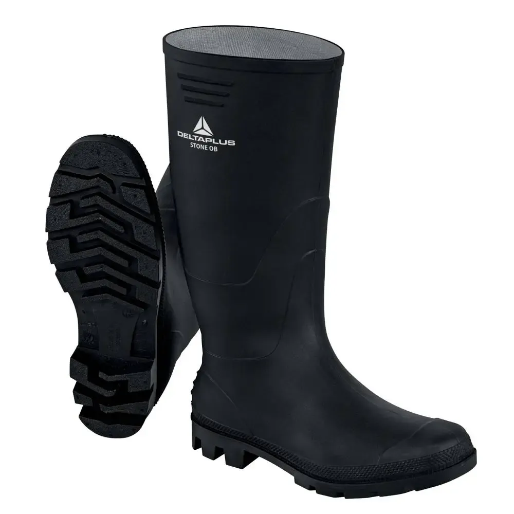 Botas de agua negras económicas modelo Stone de la marca Delta Plus para trabajos con lluvia, humedad y protección contra el barro, tanto para uso laboral como particular.
