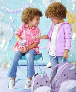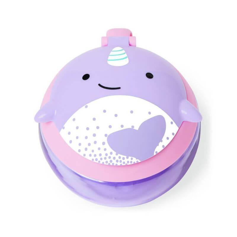 Tiene un bonito diseño morado con dibujo de pez espada, con una práctica forma redonda apta para el fácil agarre de sus pequeñas manos.