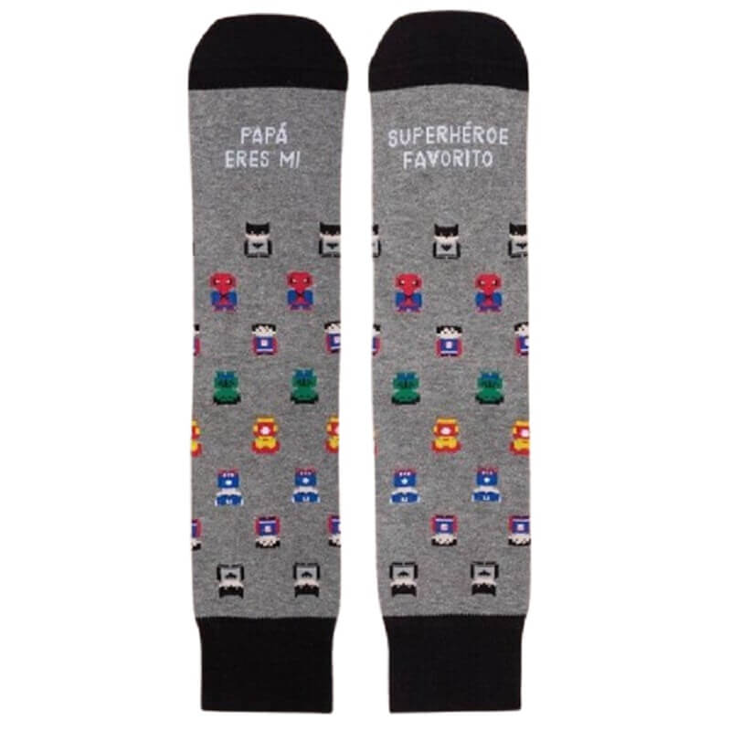 Unos divertidos calcetines que encandilarán hasta a los más mayores de la casa, con el mensaje Papá, eres mi superhéroe favorito.