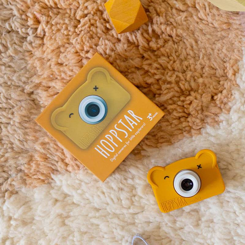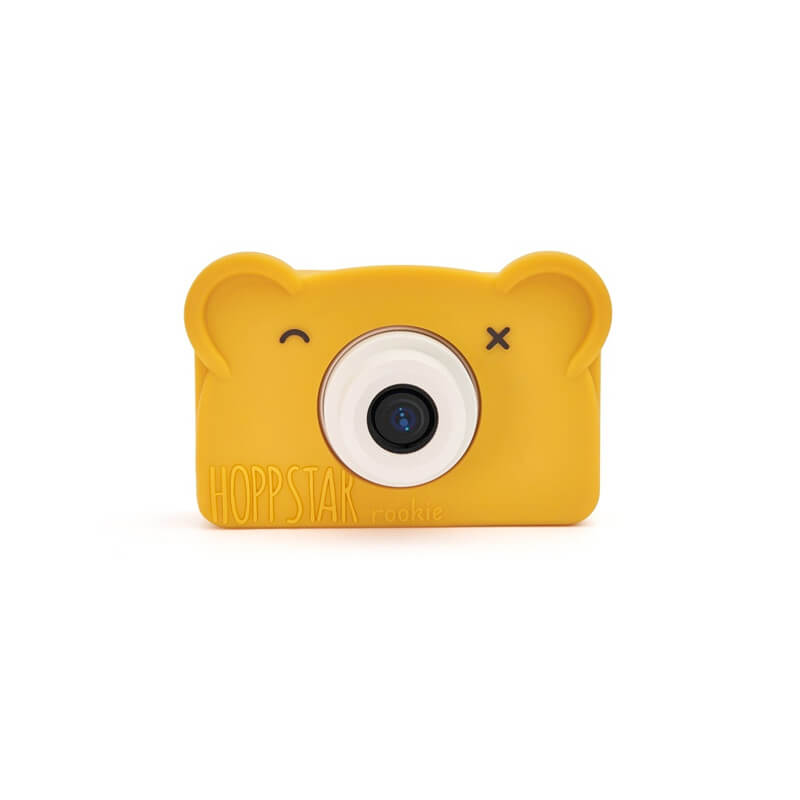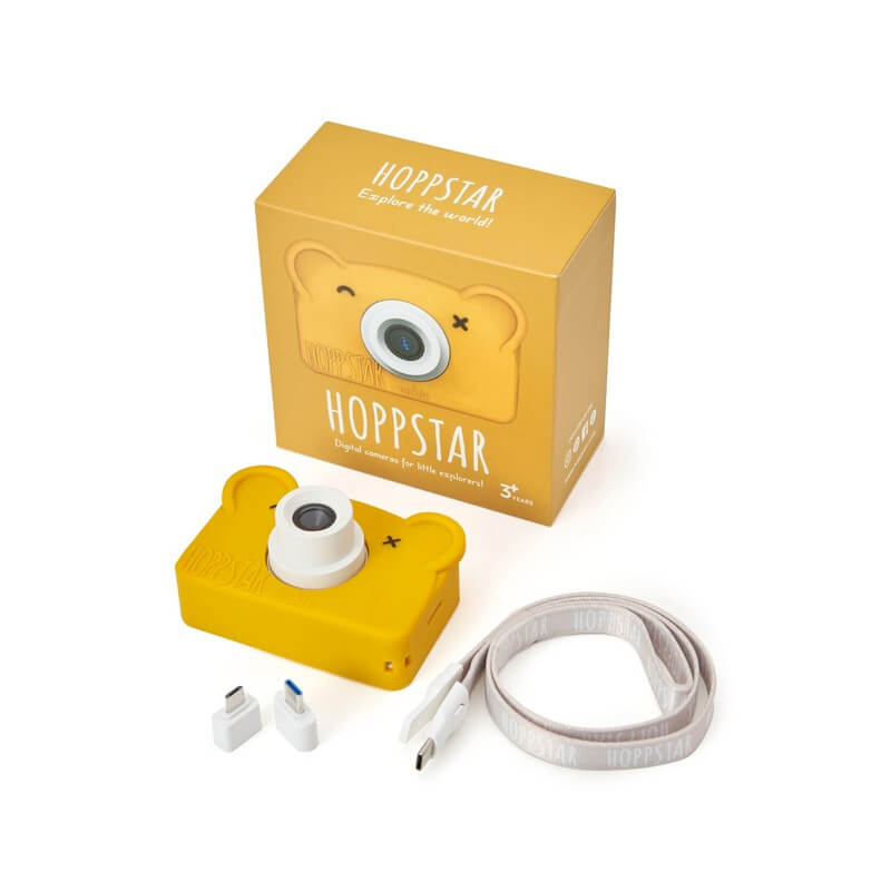 Contenido:: cámara de fotos digital para niños con funda de silicona color miel, tarjeta SD de 16 GB, 1 adaptador tipo C, 1 adaptador micro USB y cinta 2 en 1 con cable de carga integrado.