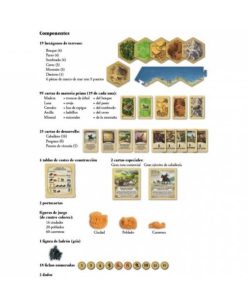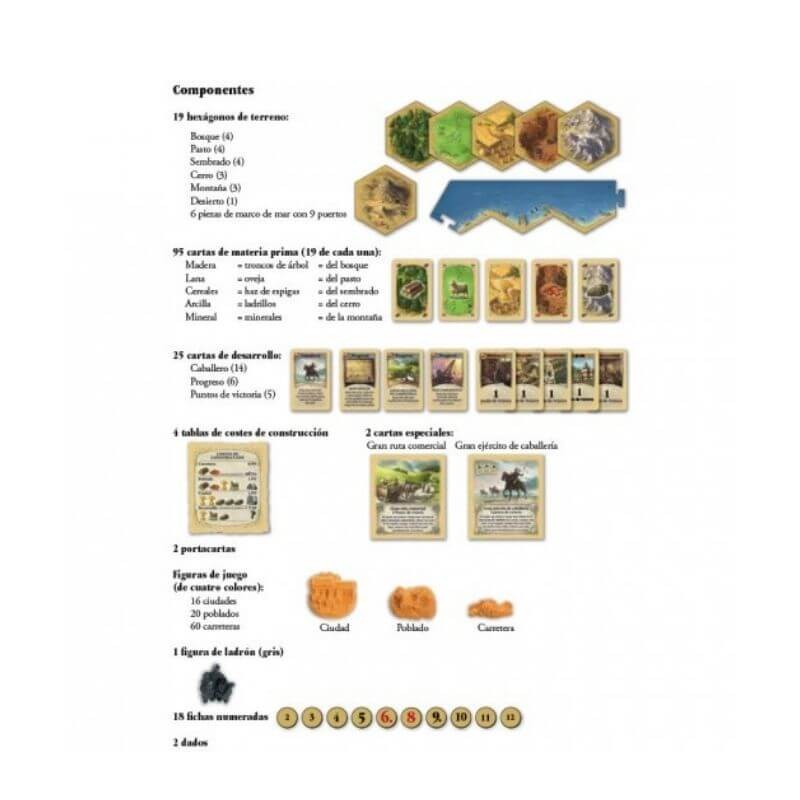 Contenido: 19 hexágonos de terreno, 95 cartas de materia prima, 25 cartas de desarrollo, 4 tablas de costes de construcción, 2 cartas especiales, 2 porta cartas, 16 figuras de ciudades, 20 figuras de poblados, 60 figuras de carreteras, figura de ladrón gris, 18 fichas numeradas, 2 dados, Instrucciones.