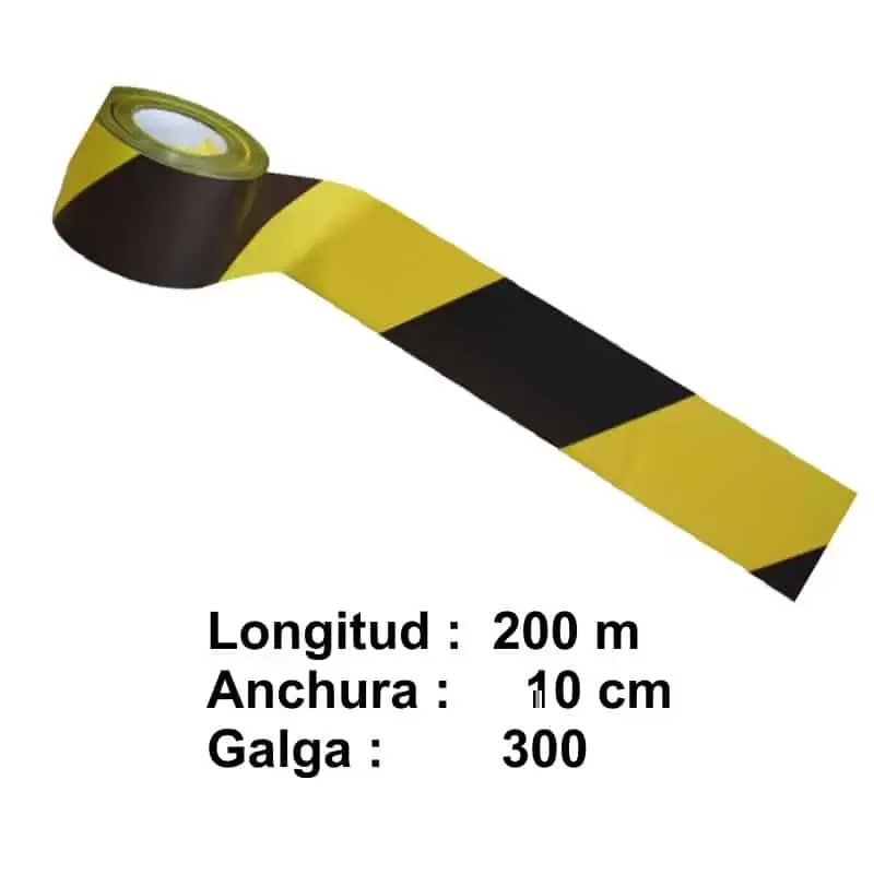 Cinta de balizamiento de plástico con un grosor superior, de galga 300 impreso a dos caras de color amarillo y negro.