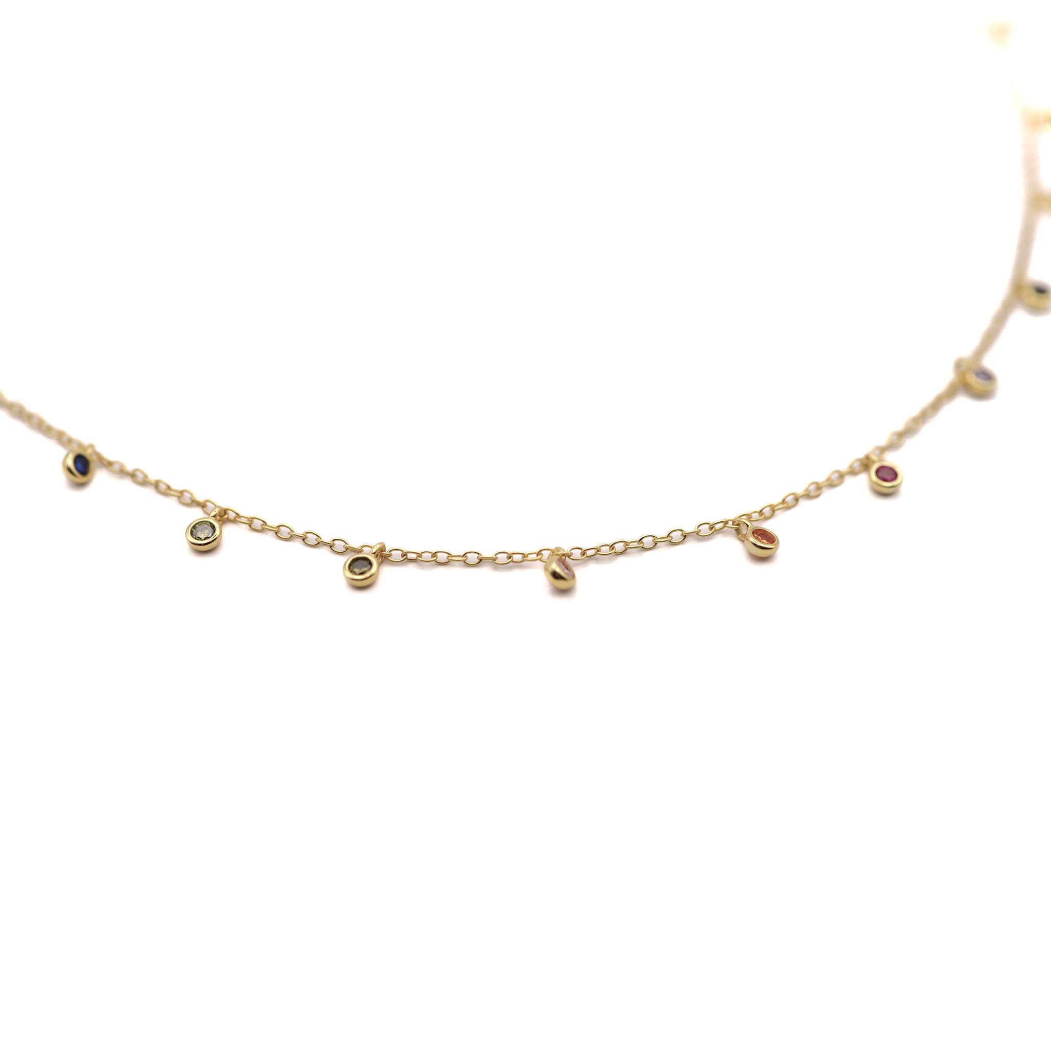 Este collar está diseñado para brillar, con múltiples dijes de zirconias de colores que aportan un toque vibrante y divertido a tu estilo. Hecho de plata esterlina con baño de oro de 18K, es una pieza versátil, perfecta para combinar y apilar con otros accesorios. ¡Dale un giro único a tu look!
