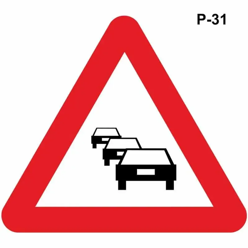 Esta señal nos indica del peligro a encontrarnos una congestión de tráfico debido a que los vehículos están detenidos o se forman colas.