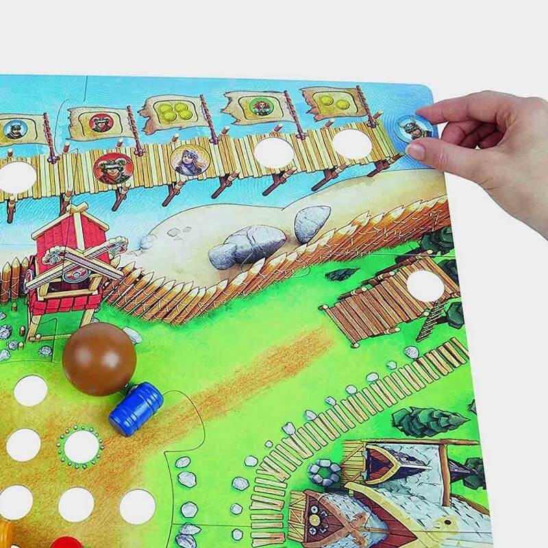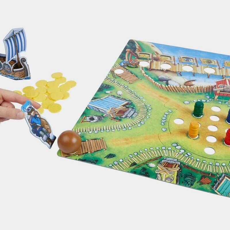 Coge la bola y el empujabolas y, desde la rampa, tumba los 4 toneles; por cada tonel tumbado, la ficha de vikingo del color correspondiente se mueve una casilla en el orden deseado hacia delante.