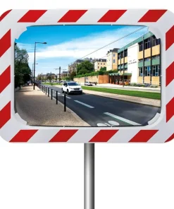 Espejos de tráfico rectangulares para exteriores fabricados con materiales de calidad y cuya principal característica es que su marco está diseñado con componentes retroreflectantes en blanco y rojo que reflejan con la luz de los vehículos y mejoran la visibilidad durante momentos de escasa luz ambiental.