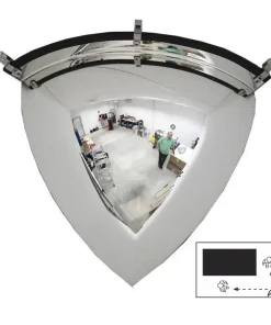 Este espejo para esquinas 1/4 esfera suele instalarse en una esquina donde se desea controlar dos vías.