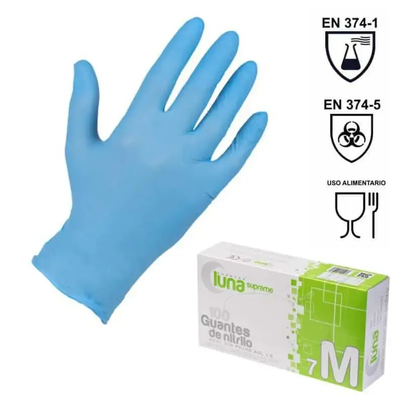 Guantes nitrilo desechables sin polvo de la marca Luna en cajas de 100 uds pensado para uso en laboratorios, electrónica, pinturas, manipulación de alimentos, sector sanitario etc.