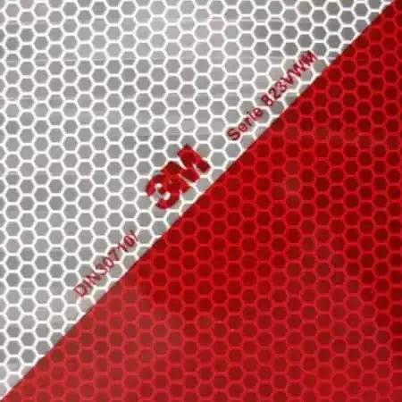 Marcaje para vehículos de la marca 3M y certificada con la norma 30710 y EN12899-1:2007 de color blanco y rojo con retroreflectante microprismática metalizada flexible de clase RA2 HIP.