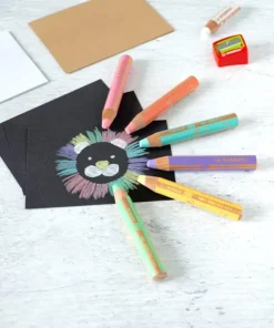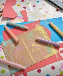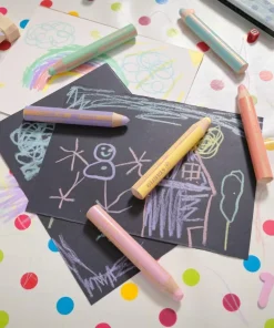 Lápices de colores pastel vibrantes y opacos, ¡incluso en papeles oscuros!, que también funcionan como ceras y acuarelas y para pintar sobre cristal. Con una mina anti-rotura XXL para dibujar y pintar desde pequeños, tan gruesa como la de 8 lápices normales: ¡10mm de diámetro!