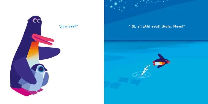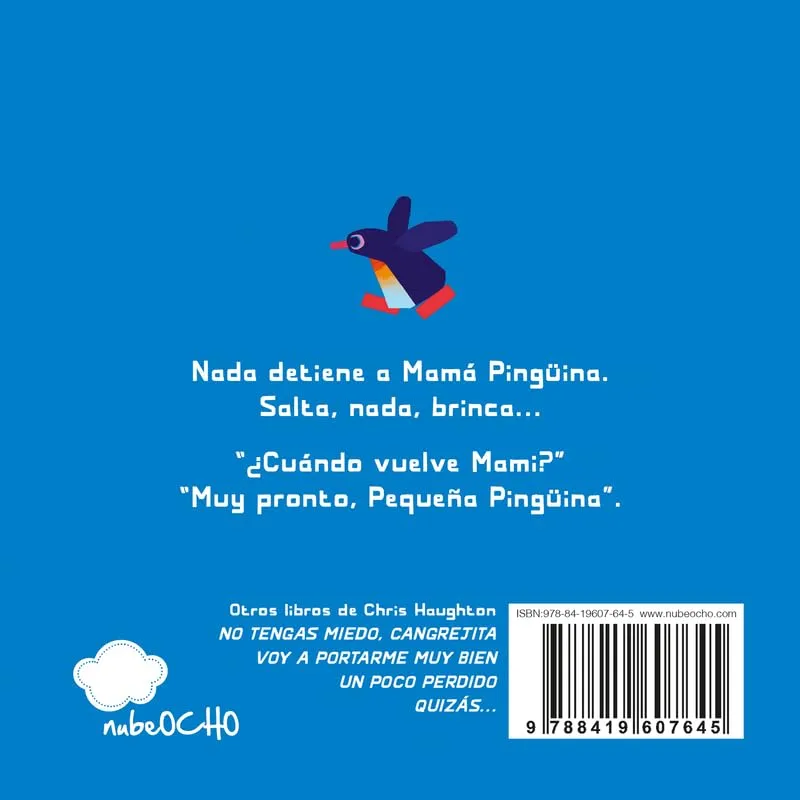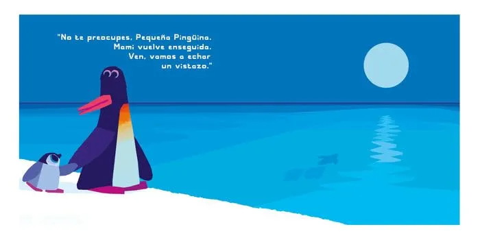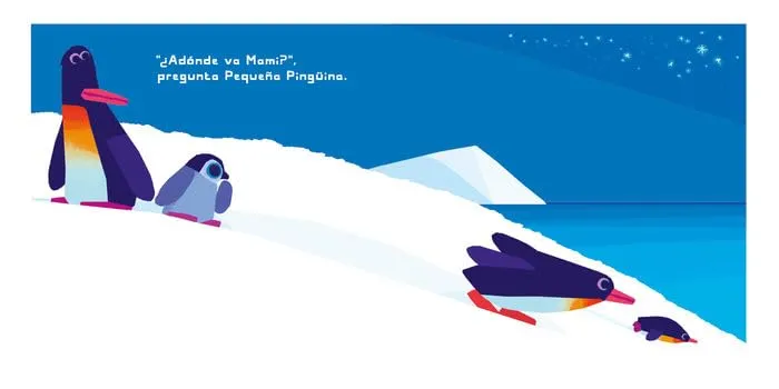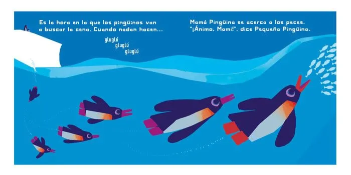 Mamá Pingüina sale a buscar la cena. Salta, nada, escala un resbaladizo acantilado y pasa de puntillas… ¡junto a unas feroces focas dormidas! Pequeña Pingüina la mira desde lejos y pregunta: «¿Mami volverá pronto?». “Seguro que sí”, dice Papá Pingüino. ¿Conseguirá Mamá Pingüina reunirse con su familia a tiempo para la cena?
