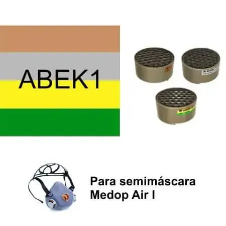 Filtros respiratorios combinados con protección ABEK1 compatibles con las semimáscaras de un sólo filtro Medop Air I para protección contra ambientes con gases y vapores tóxicos.