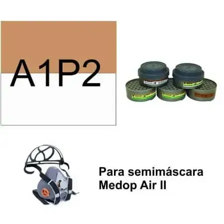 Filtros respiratorios combinados con protección A1P2 compatibles con las semimáscaras de dos filtros Medop Air II para protección contra ambientes con gases y vapores orgánicos y partículas.