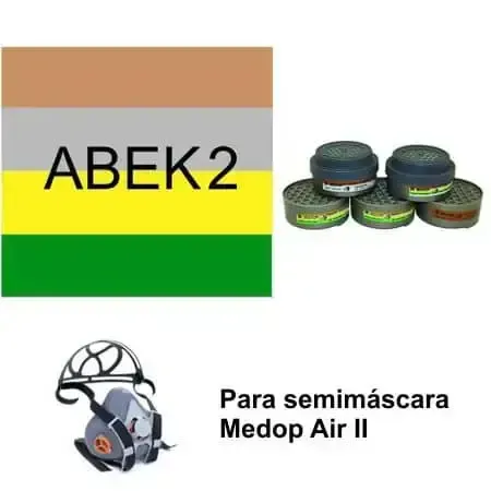 Filtros respiratorios combinados con protección ABEK2 compatibles con las semimáscaras de dos filtros Medop Air II para protección contra ambientes con gases y vapores orgánicos, inorgánicos, ácidos y amoniaco.