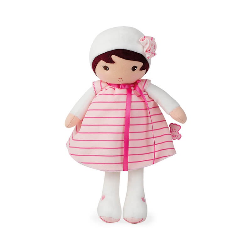 Con una carita muy dulce, un bonito vestido a rayas color rosa, gorro, corazones bordados en los tobillos y un precioso lacito en el cuello que caracteriza a todas las muñecas de la colección Tendresse de Kaloo.