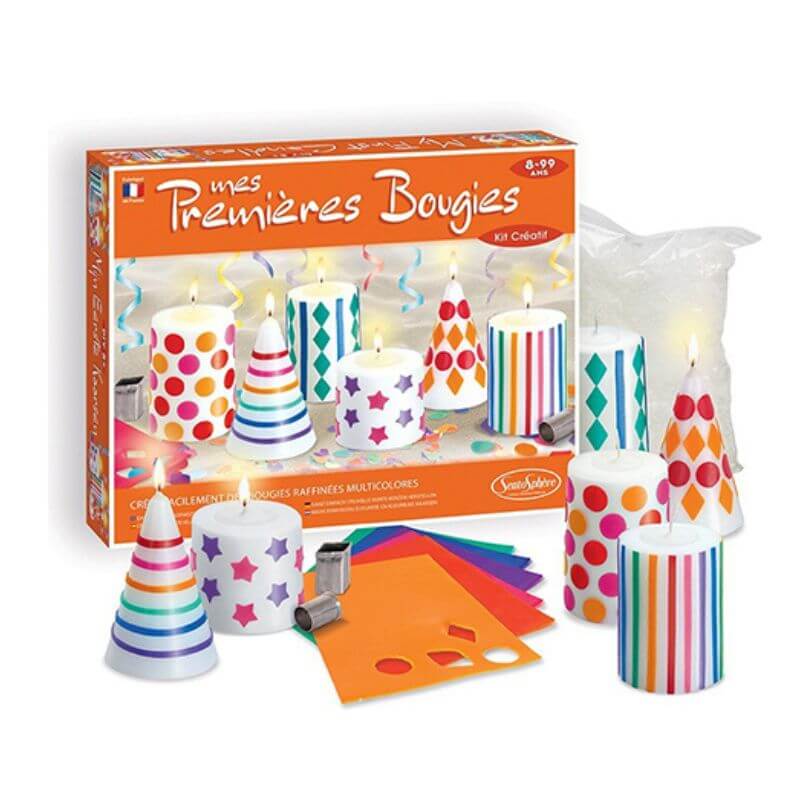Contenido: 700g de cera, 3 moldes, 1,5m de mecha, 3 colorantes, 6 láminas de cera de colores para decorar, 2 formas para recortar e instrucciones.