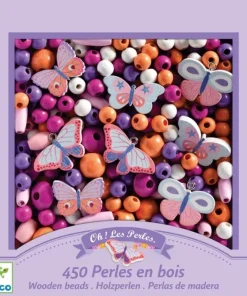 Set de 450 piezas con perlas y piezas de inspiración Mariposas, para ensartar con los cordones siguiendo los agujeros, de Djeco.