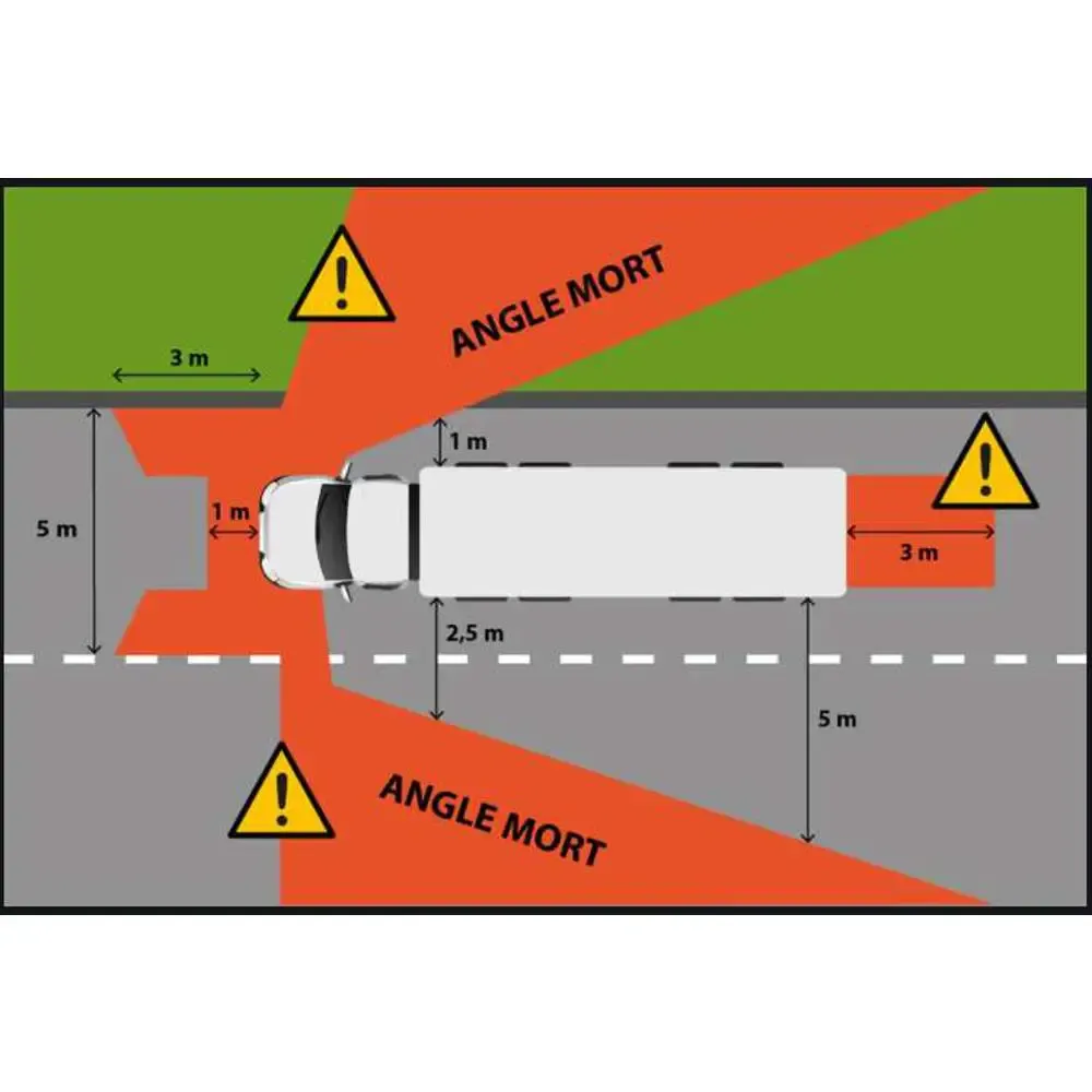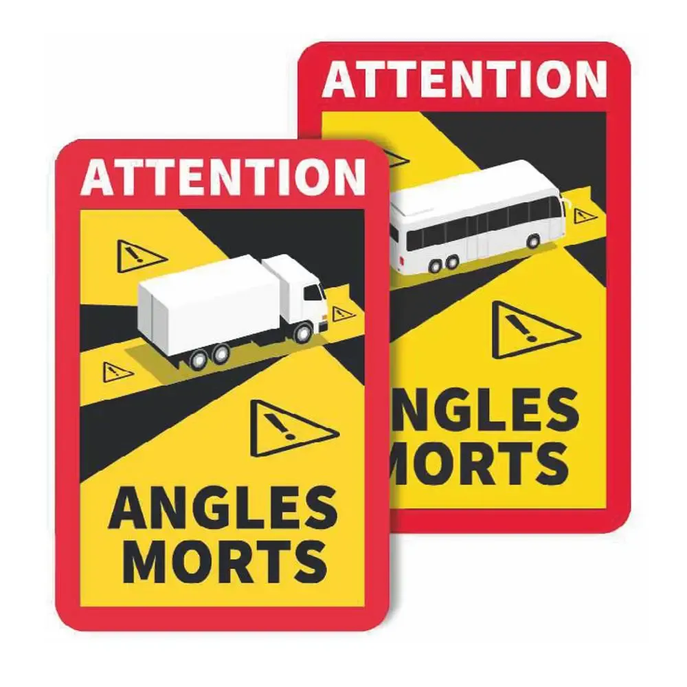 La señal angles morts ( en francés ) cuyo significado en español es «ángulos muertos» está fabricada en vinilo adhesivo y está homologada para instalarse en camiones o autobuses.