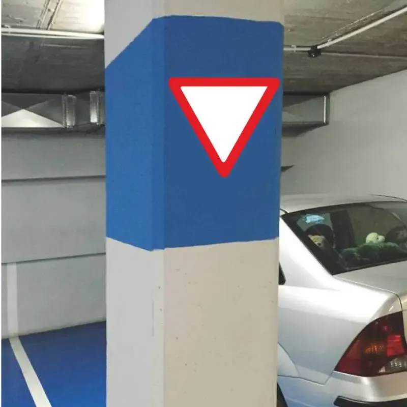 Señal de ceda el paso para pilares de parking o paredes R-1 con un tamaño más reducido de lo normal ( 30 cm ) para que puedan instalarse en una columna sin sobresalir de ésta.