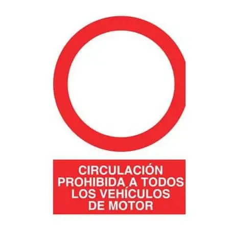 Esta señal de seguridad prohíbe a todos los vehículos de motor circular por un determinado lugar. Suele instalarse dentro de centros de trabajo como almacenes.