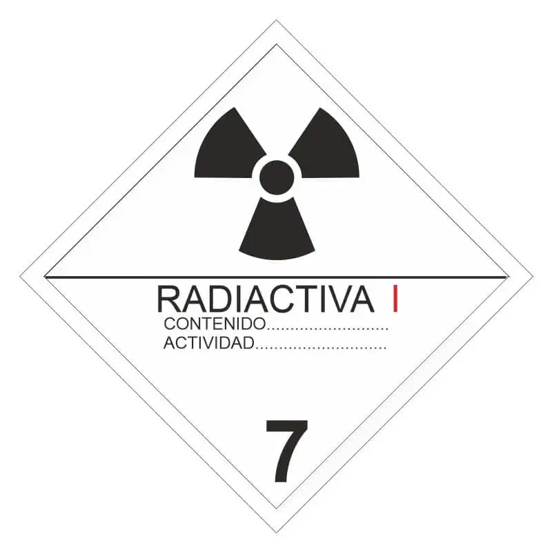 Etiquetas ADR clase 7 y nivel I con dos tamaños diferentes y varios materiales como vinilo adhesivo, poliestireno o aluminio con el objetivo de informar a las personas del tipo de mercancía peligrosa que se está transportando.