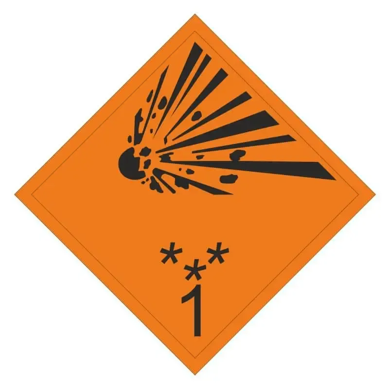 Señales o etiquetas ADR de materias y objetos explosivos con dos tamaños diferentes y varios materiales como vinilo adhesivo, poliestireno o aluminio con el objetivo de informar a las personas del tipo de mercancía peligrosa que se está transportando.