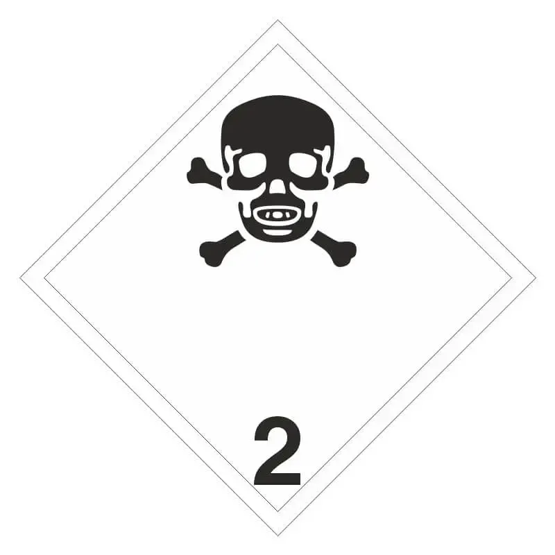 Etiquetas ADR de mercancías peligrosas de clase 2 con dos tamaños diferentes y varios materiales como vinilo adhesivo, poliestireno o aluminio con el objetivo de informar a las personas del tipo de mercancía peligrosa que se está transportando.