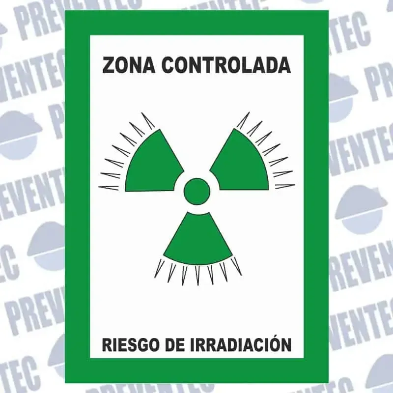 Señal zona controlada con riesgo de irradiación en polietileno, vinilo adhesivo o aluminio para señalizar zonas con radiación.