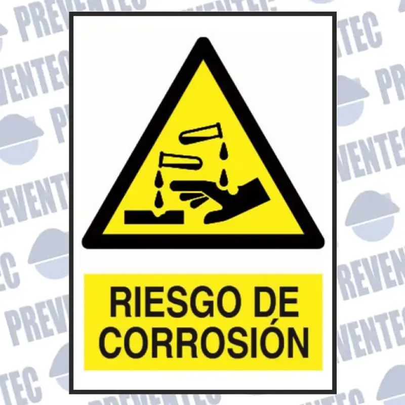 Estas señales de seguridad nos advierten del peligro por sufrir una lesión por corrosión al tratar con productos químicos corrosivos.