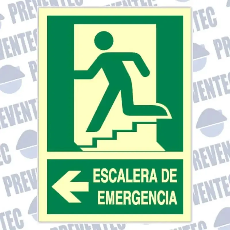Esta señal nos informa que en caso de emergencia debemos bajar unas escaleras que están hacia la izquierda.