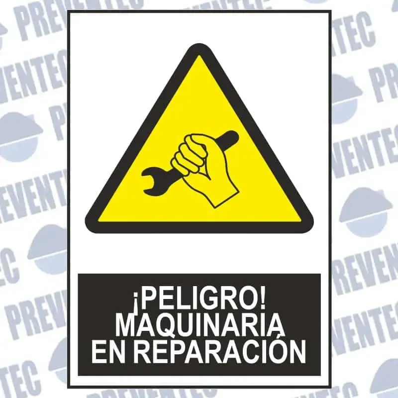 Señal maquinaria en reparación en material PVC, vinilo adhesivo o aluminio. Gran variedad de tamaños disponibles y opciones como pictograma troquelado o sin texto.