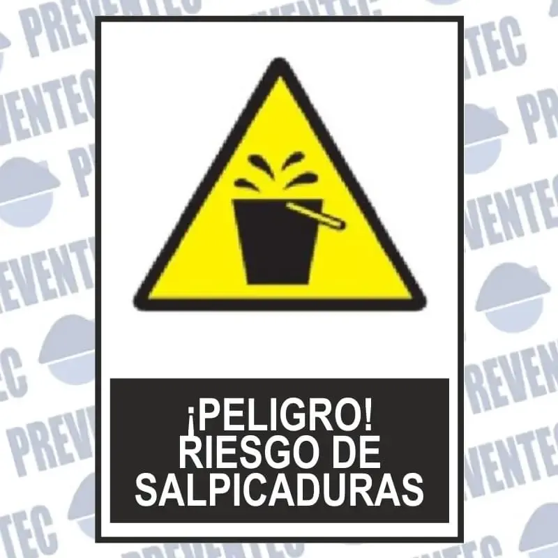 Señal peligro riesgo de salpicaduras en material PVC, vinilo adhesivo o aluminio. Gran variedad de tamaños disponibles y opciones como pictograma troquelado o sin texto.