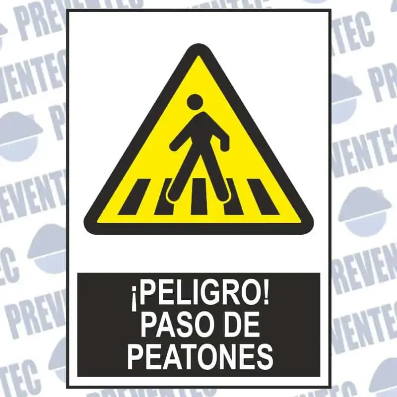Estas señales de advertencia suelen instalarse dentro de centros de trabajo como almacenes y advierten a los conductores de carretillas u otros vehículos de que vamos a pasar por un cruce en el que se pueden encontrar peatones.