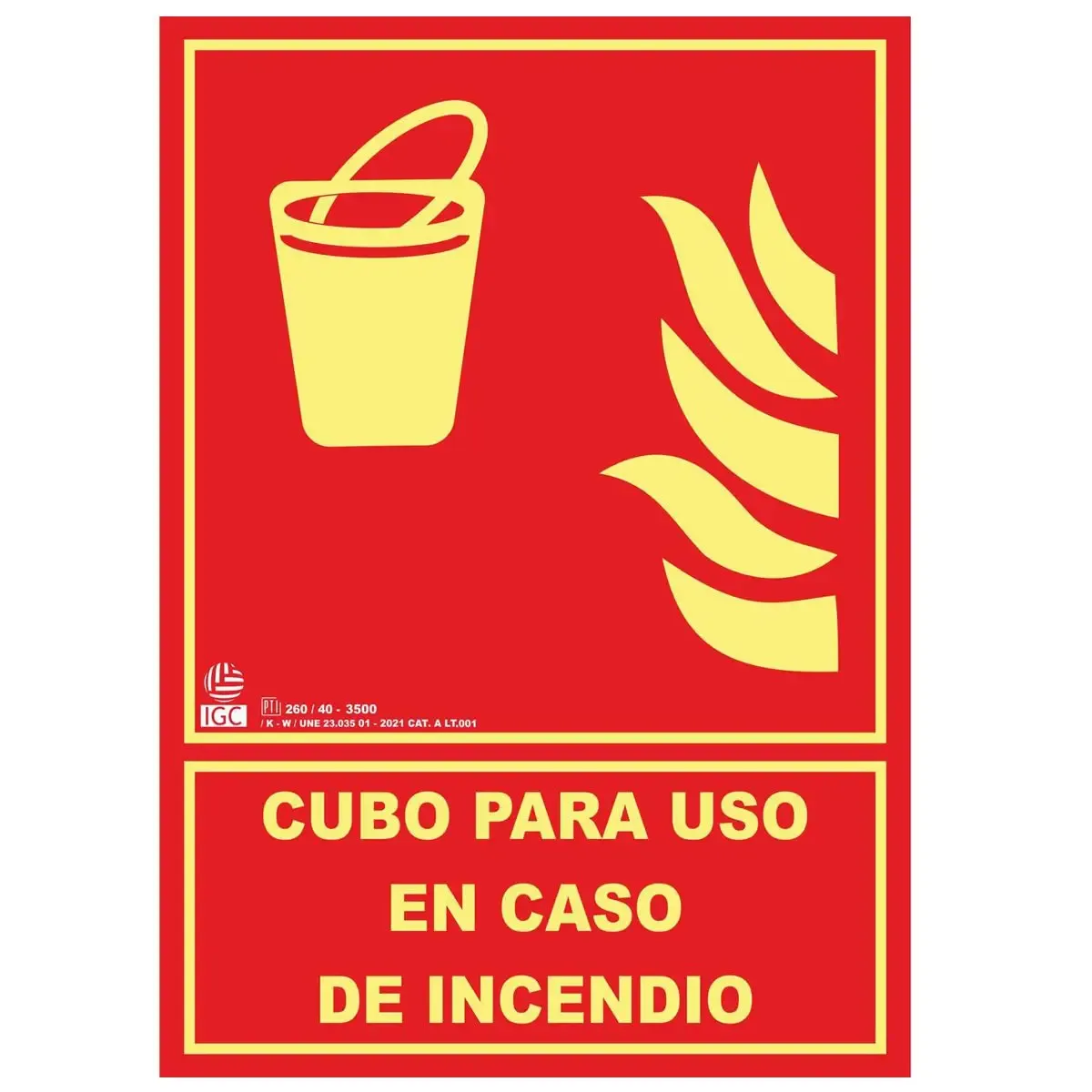 Señal cubo para incendios fabricada en material PVC con material fotoluminiscente de CLASE A y CLASE B con tamaño de DIN A4 o A2