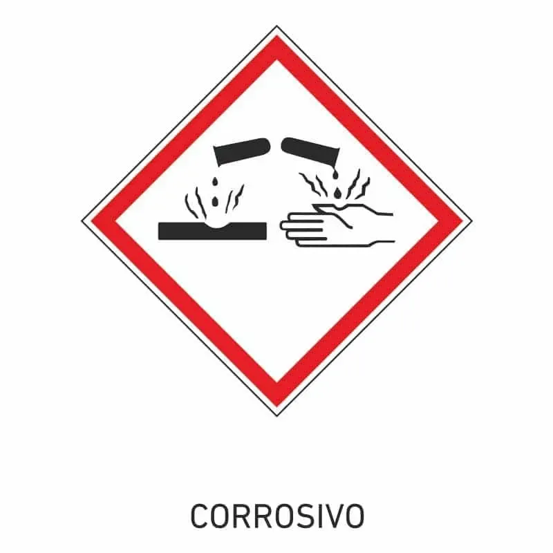 Señal corrosivo conforme según reglamento CLP CE 1272/2008 que están armonizadas con los criterios del Sistema Globalmente Armonizado (SGA) de las Naciones Unidas sobre clasificación, etiquetado y envasado de sustancias y mezclas químicas.