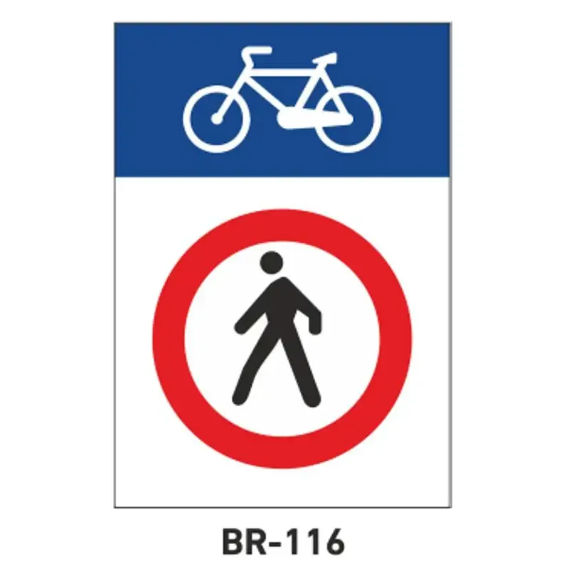 Señal para ciclo-ruta BR-116 de entrada prohibida a peatones con un diseño homologado y que indican las normas de tráfico que deben cumplir los ciclistas.