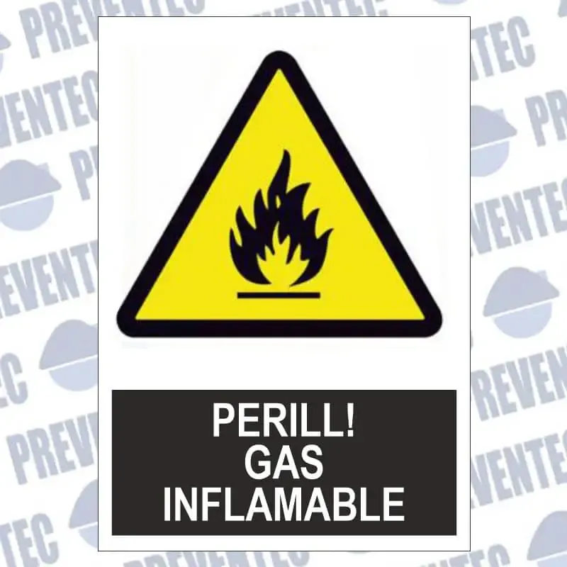 Senyal perill gas inflamable fabricades en PVC de 1 mm gruix o en vinil adhesiu amb diverses grandàries.
