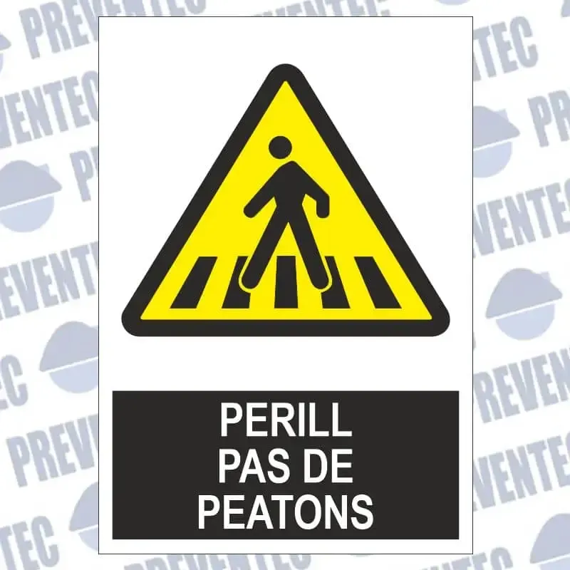 Senyal perill pas de peatons fabricades en PVC de 1 mm gruix o en vinil adhesiu amb diverses grandàries.