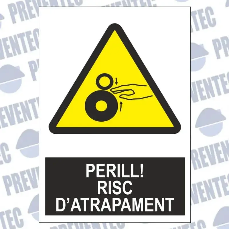 Senyal perill risc d’atrapament fabricades en PVC de 1 mm gruix o en vinil adhesiu amb diverses grandàries.