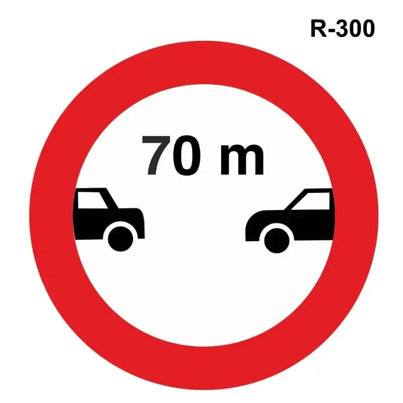 Esta señal nos informa de la prohibición de circular sin mantener con el vehículo precedente una separación igual o mayor a la indicada en la señal, excepto para adelantar. Si aparece sin la indicación en metros, hay que recordar que de forma genérica que debe guardarse la distancia de seguridad entre vehículos establecida reglamentariamente.