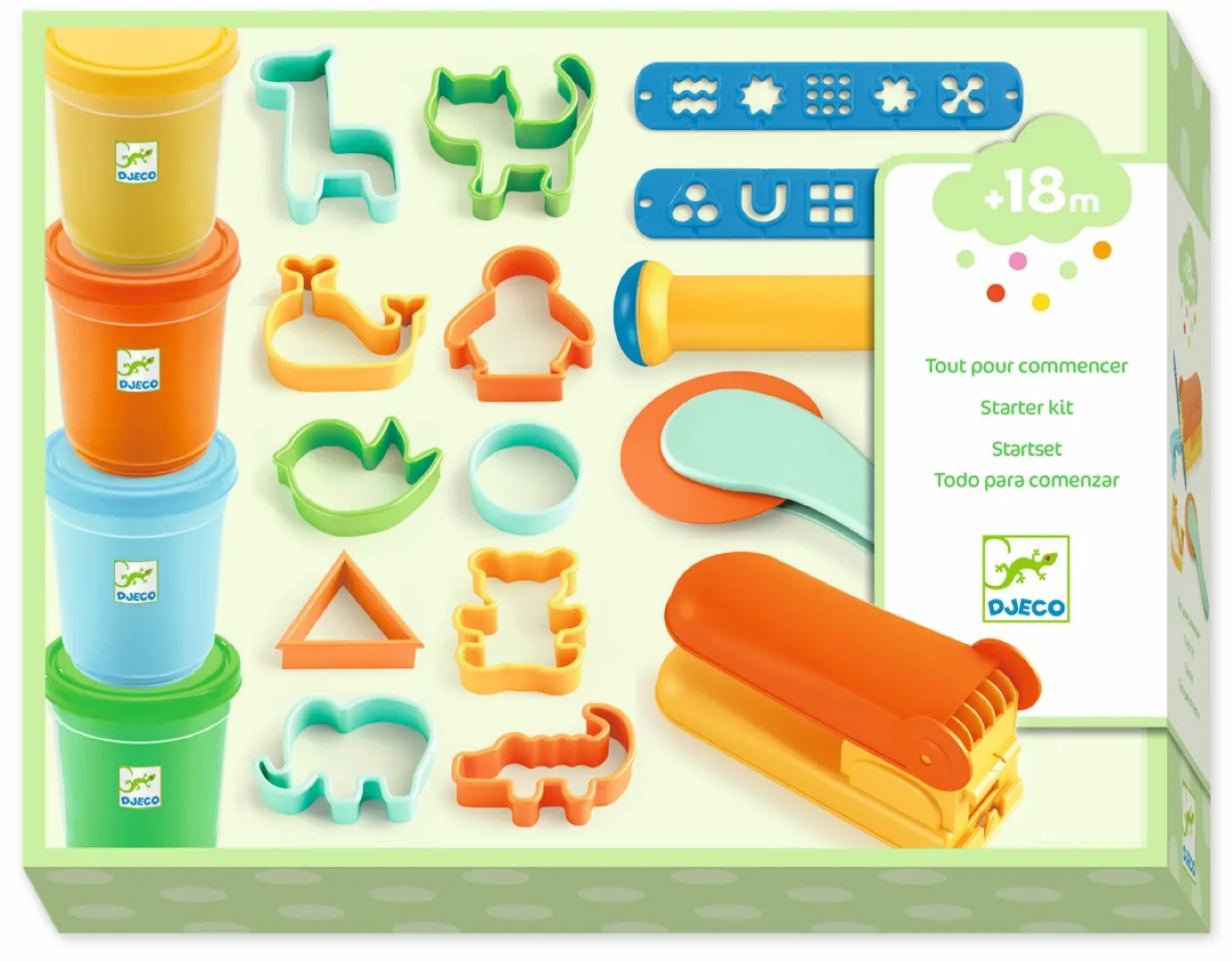 • Con 17 accesorios para modelar la plastilina: rodillo, cortador, 12 moldes y una prensa con 2 plantillas para crear 10 formas distintas.