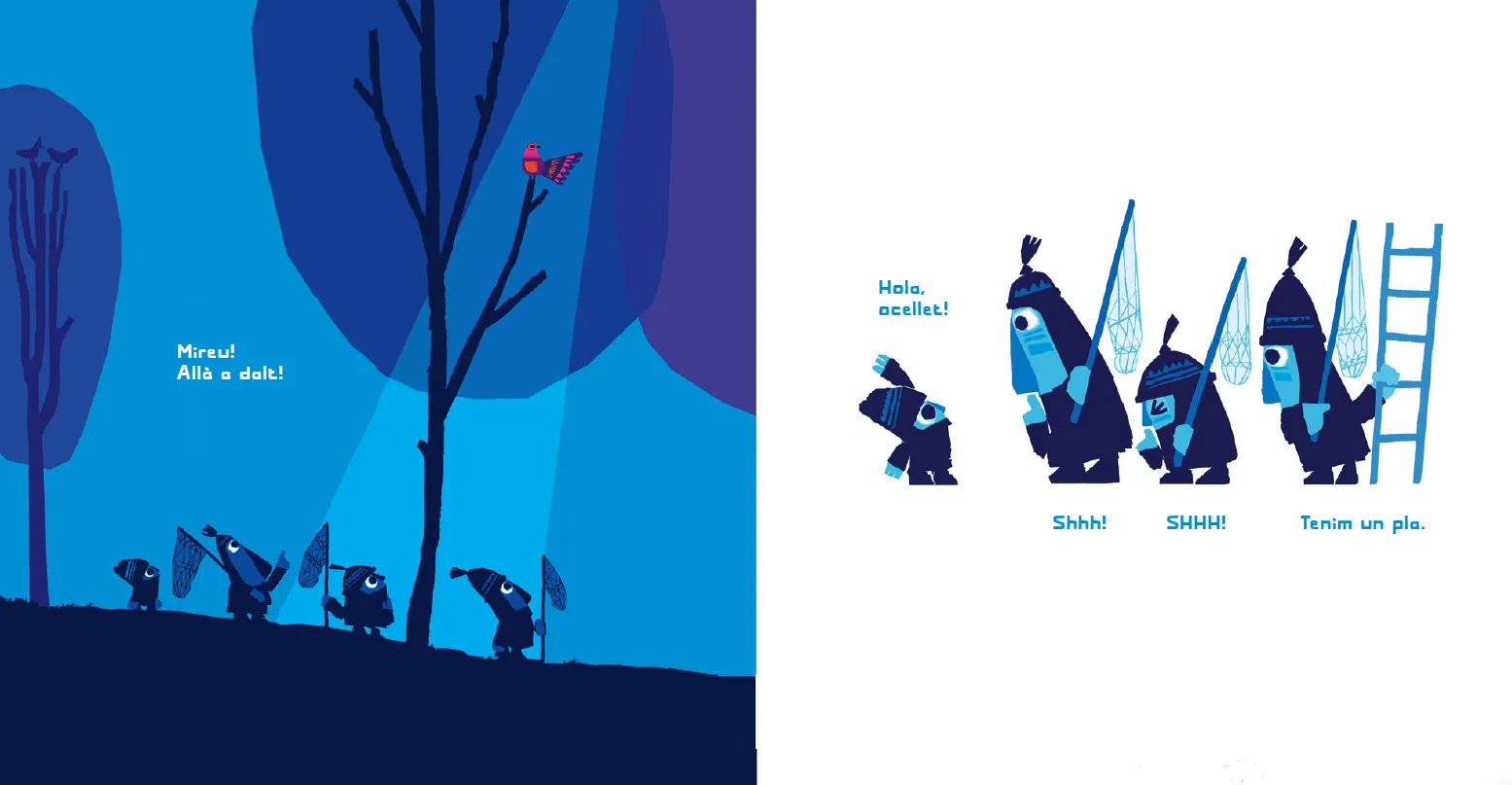 Quatre personatges caminen pel bosc amb un caçapapallones. Quan veuen un ocellet, es comencen a moure sense fer soroll. Shhh! Tenim un pla!