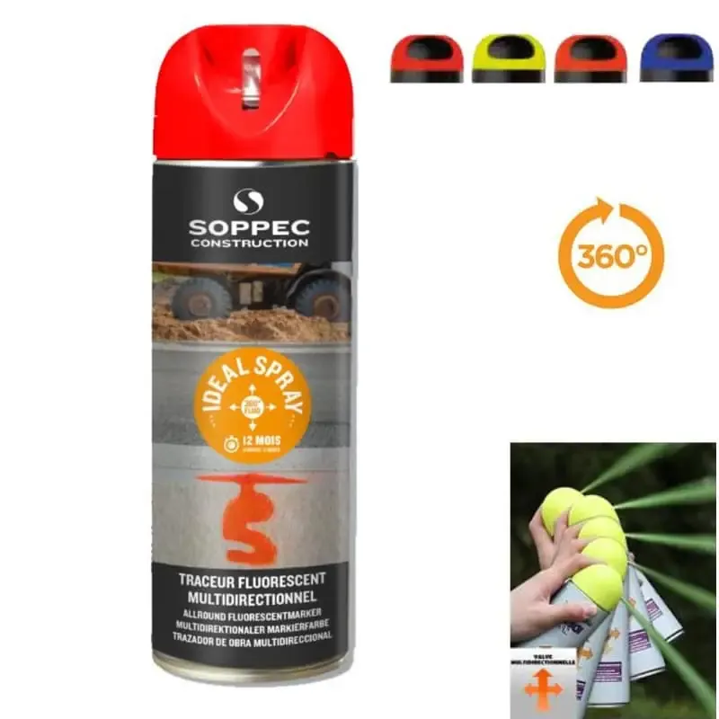 Spray marcador obra de la marca Soppec modelo 360 IDEAL utilizado para todo tipo de trabajos de marcación y localización en cualquier dirección gracias a que su válvula es multidireccional de 360º.