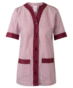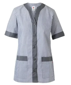 Este uniforme de limpieza del fabricante Velilla consiste en una chaqueta con botones centrales, diseño entallado para mujer y vivos de contraste ideal para mujeres en trabajos de limpieza.
